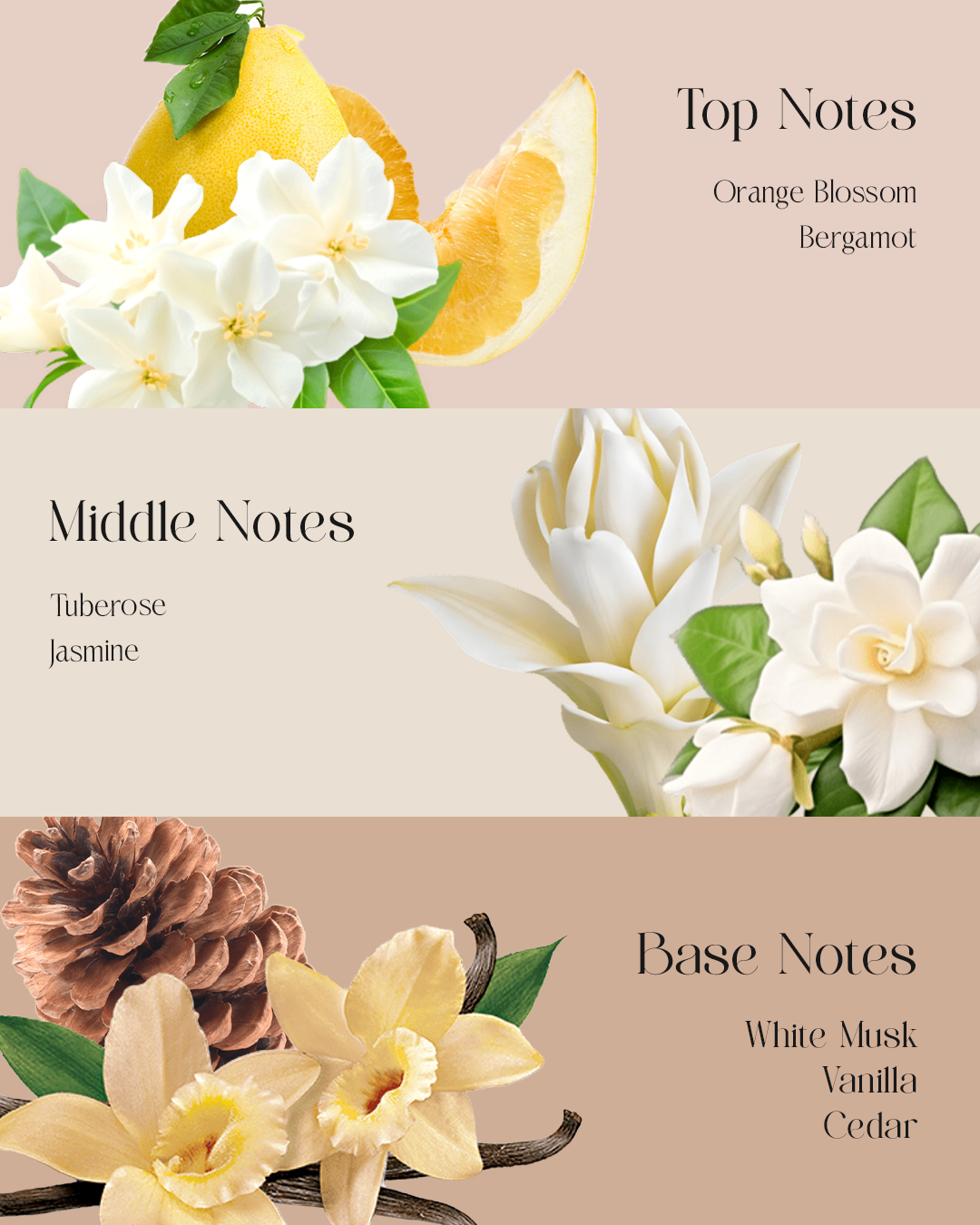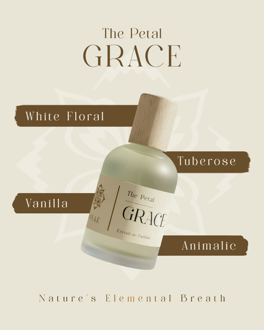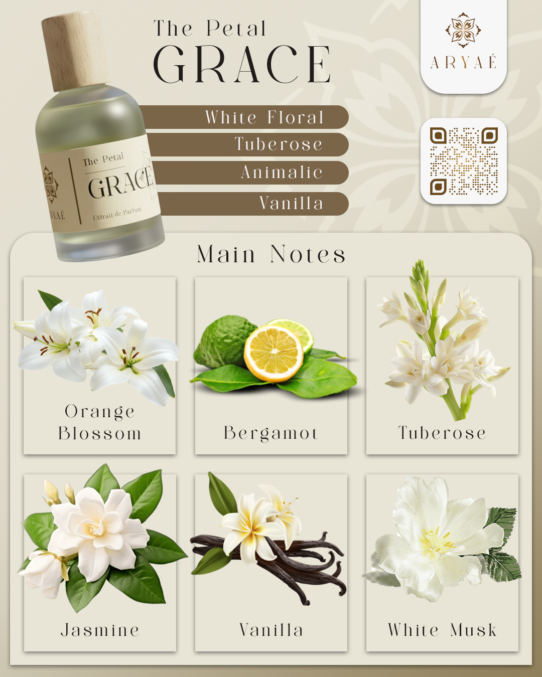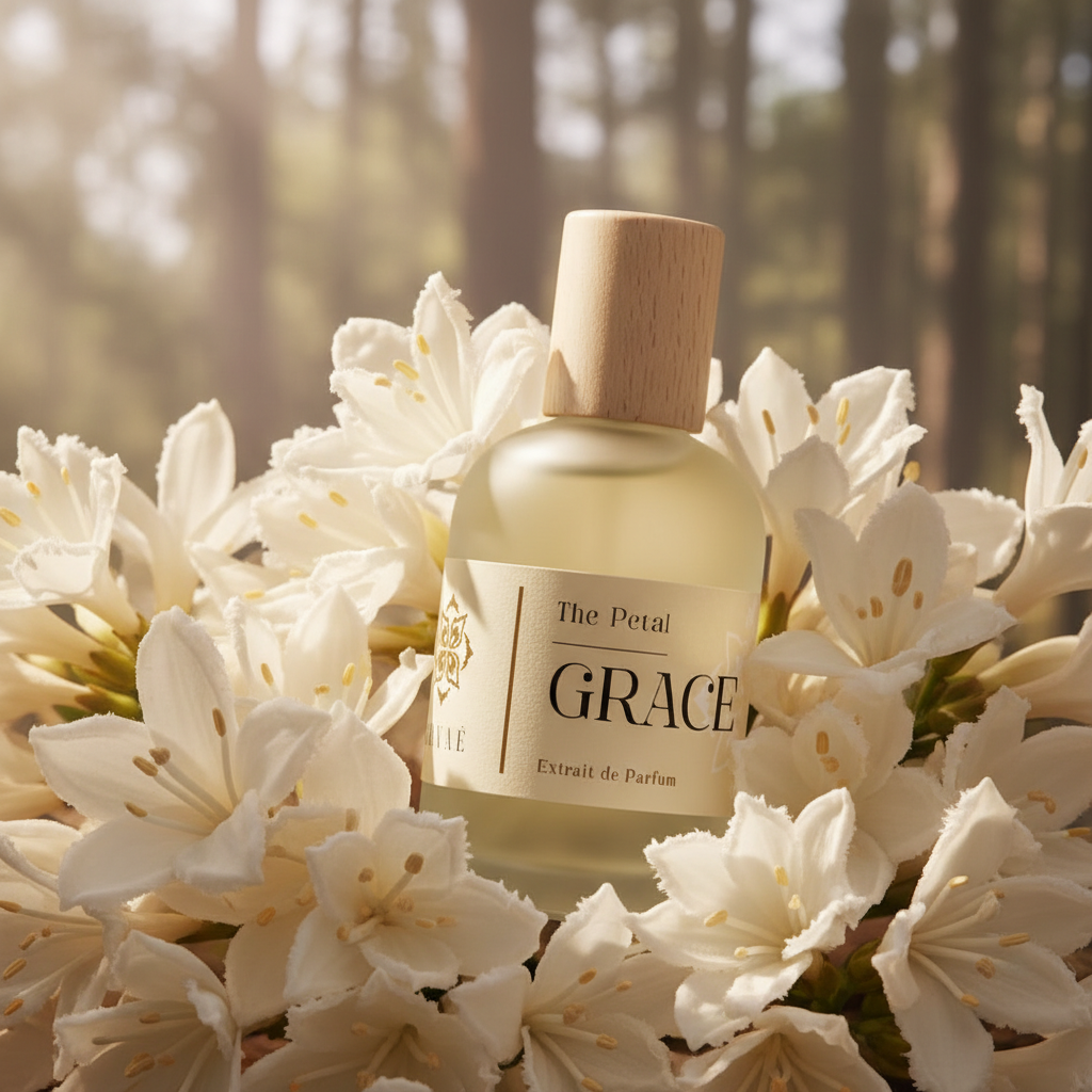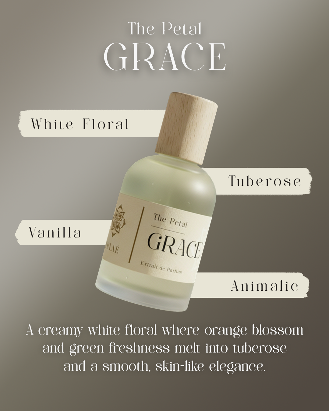 GRACE is a creamy white floral scent where luminous orange blossom and soft green facets rise gently, unfolding into rich tuberose and smooth floral depth. It opens with soft white petals and a delicate floral glow, carrying a natural sweetness shaped by subtle warmth. As it settles, the fragrance becomes intimate and composed, leaving a warm, skin like trail that feels elegant, confident, quietly powerful, and enduring.