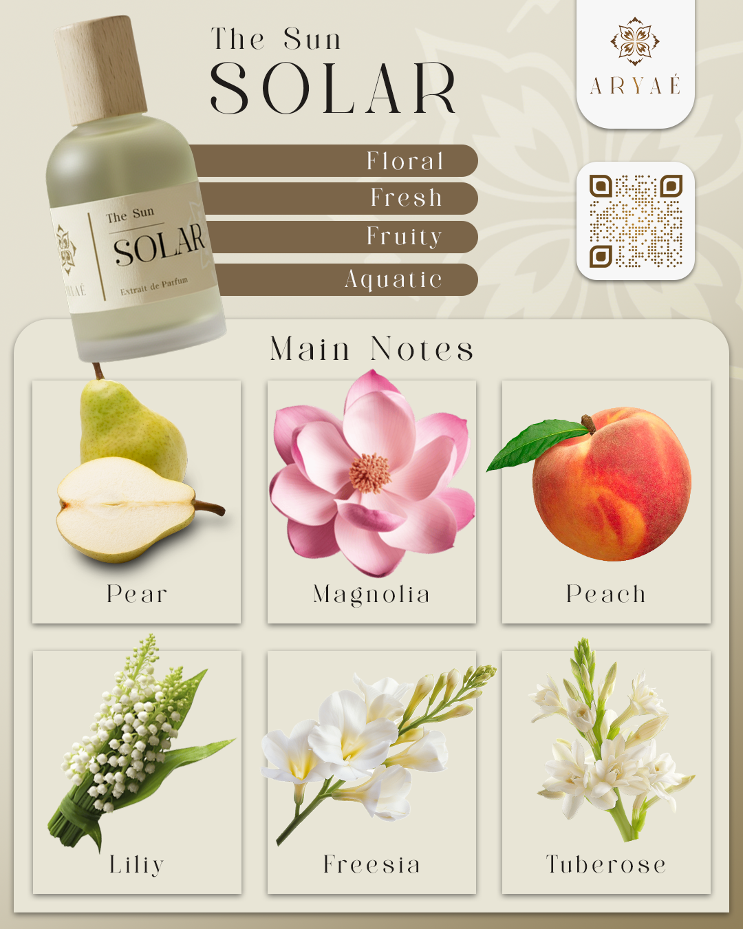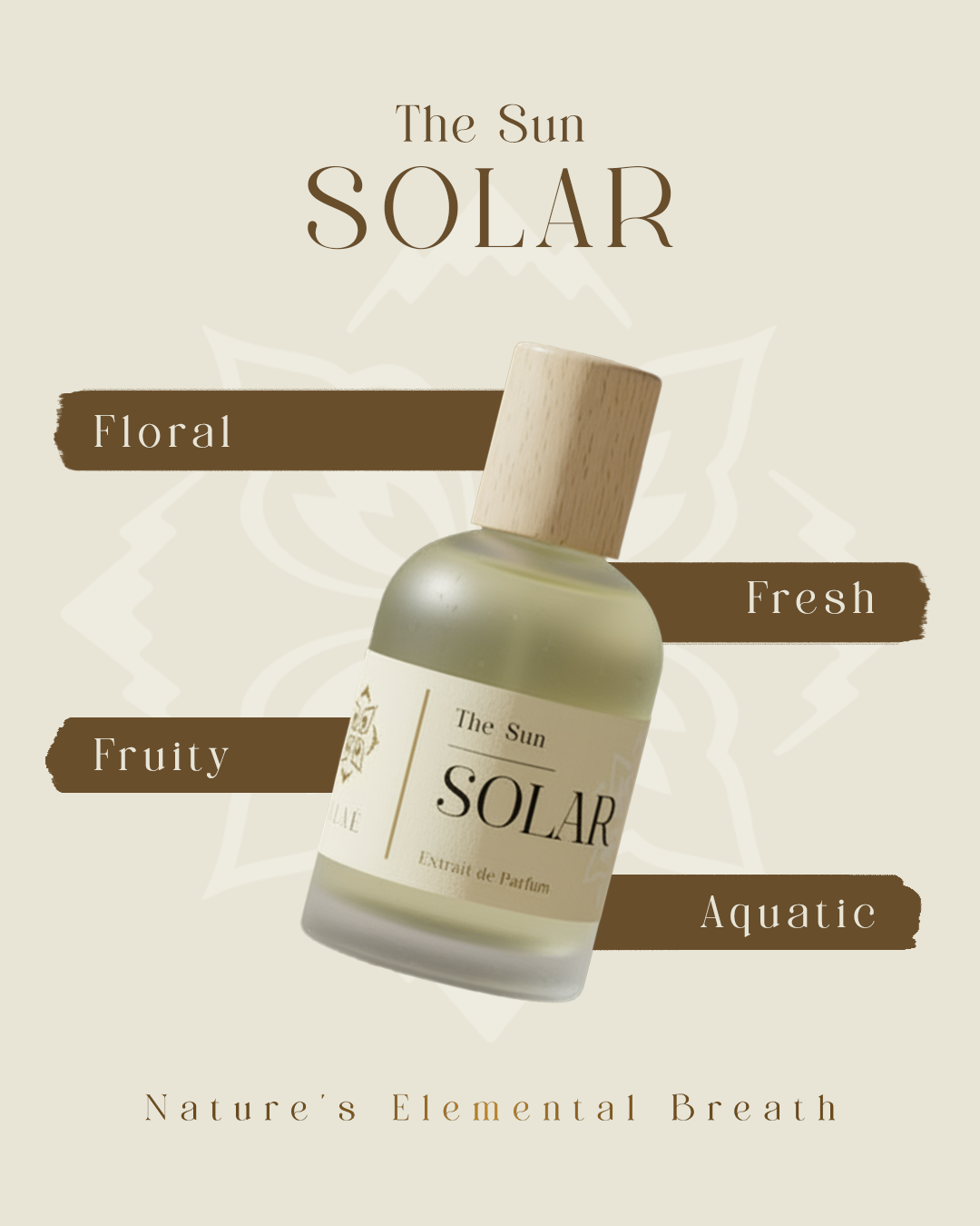 SOLAR is the element of pure light, capturing the heat of the sun at its highest point where everything it touches turns to gold. It carries the feeling of total exposure and abundance, like warmth rising from a field of white flowers that have spent the whole day drinking in the light. This is the most active presence in the collection, shaped around energy, growth, and the unapologetic brilliance of nature. SOLAR is not about shadows but about the peak of the bloom, designed for a presence that feels luminous and warm, like a sun drenched afternoon, rich, opulent, and vibrantly alive, the true breath of a summer day.